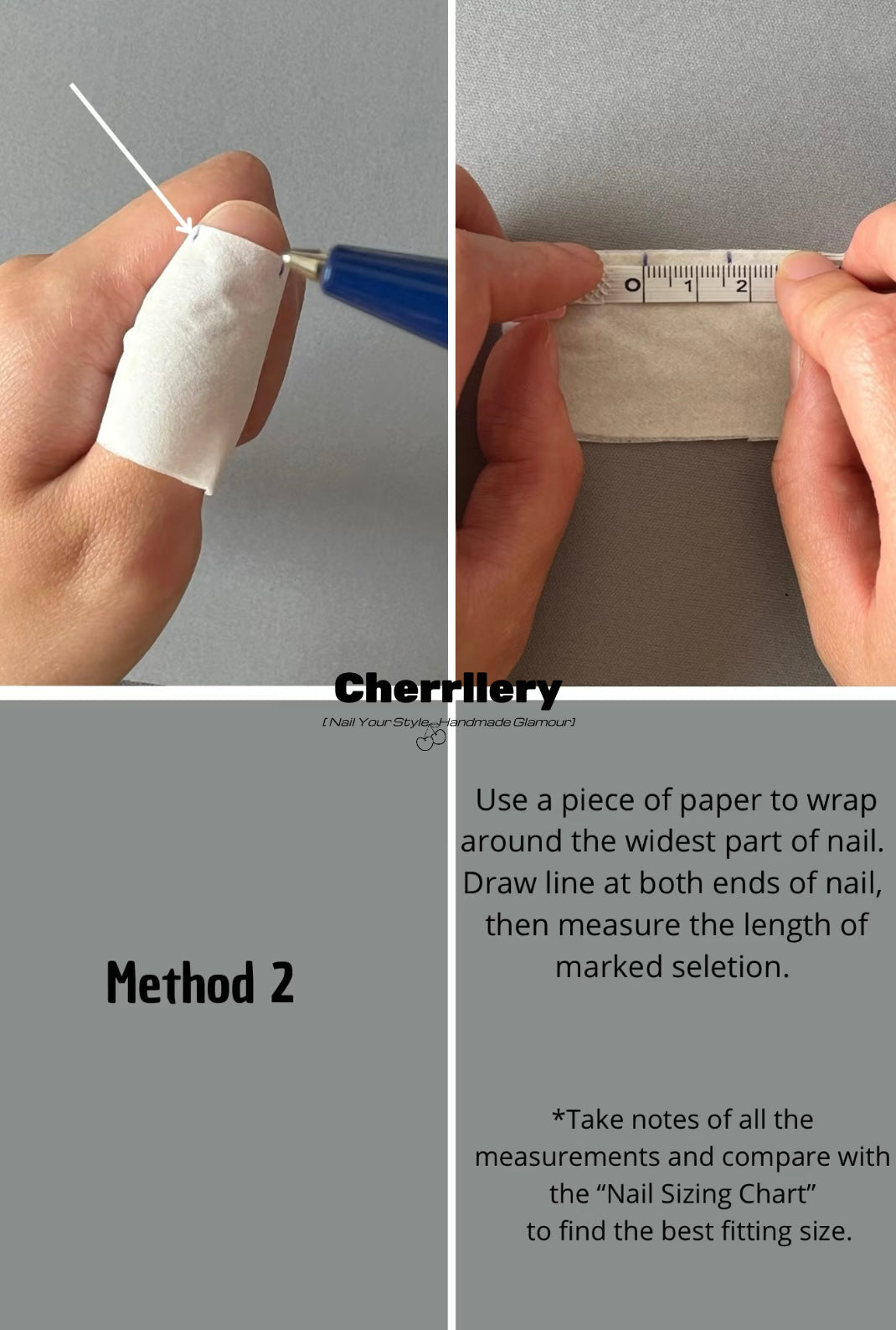 Use a piece of paper to wrap around the widest part of nail and then measure the length of marked selection.