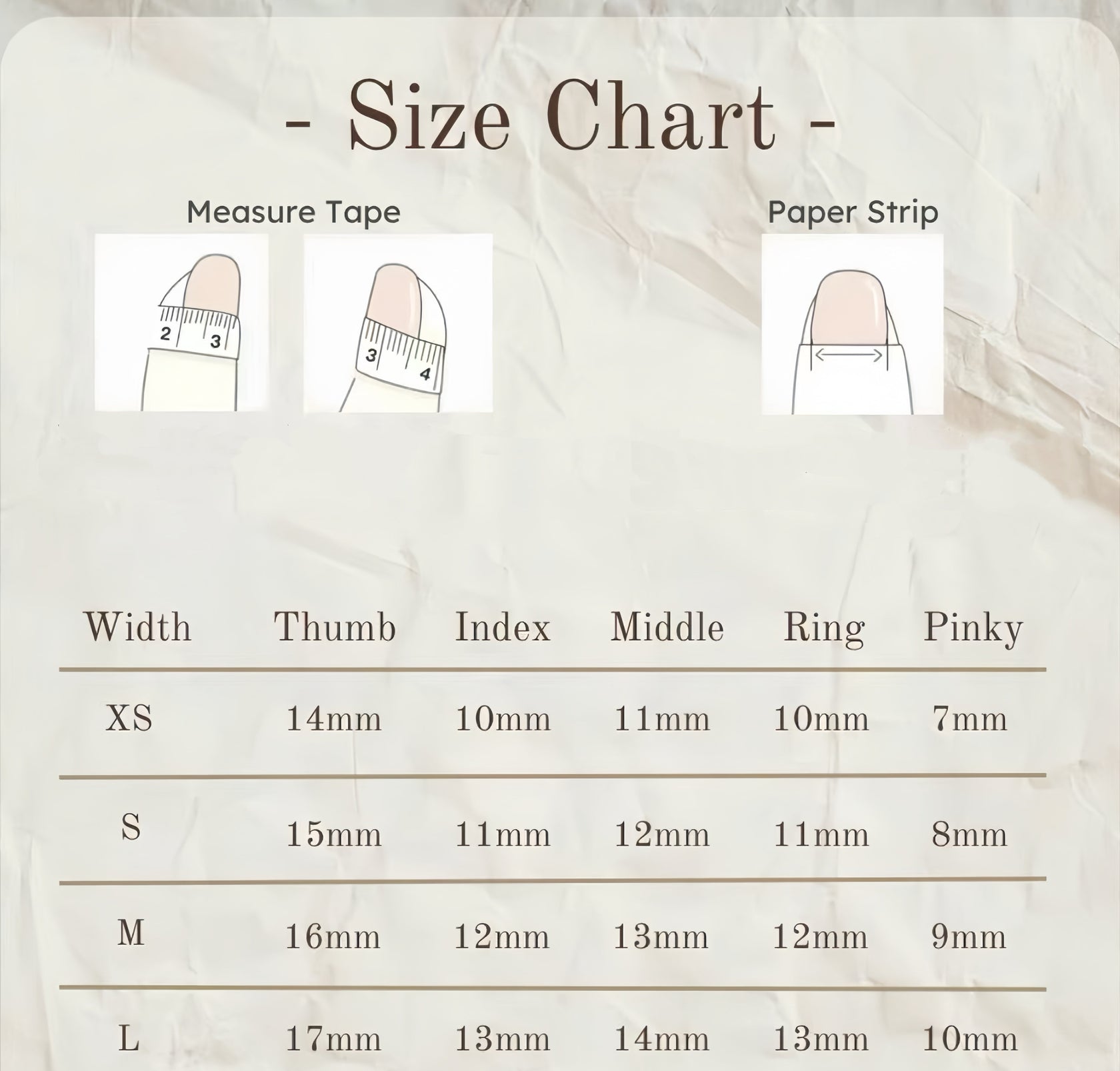 For example, if your nails measure approximately 14.5mm, 10.5mm, 11mm, 10mm, and 8mm—between XS and S—it’s best to choose size S. - Some styles may fit slightly smaller. You’ll find ‘True to Size’ or ‘Runs Small’ details listed under each nail style for easy reference.