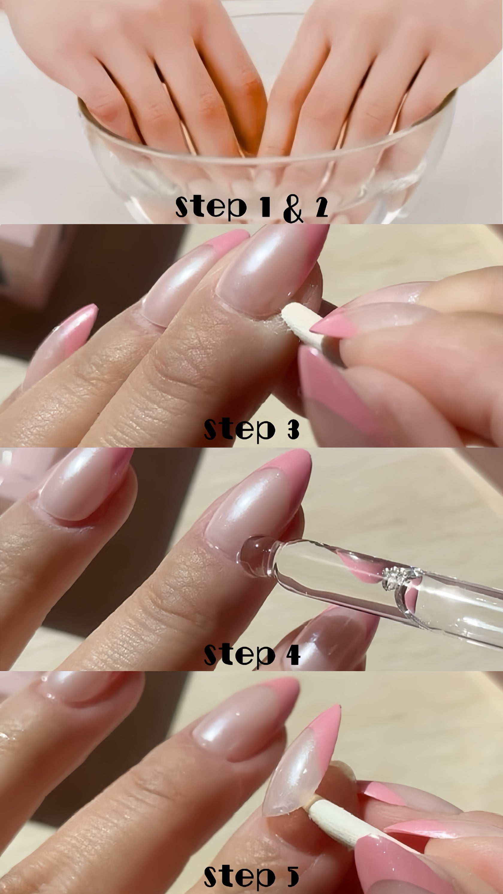 Step 1. Wash your hands thoroughly with soap and water to remove any oils or residue. Gently push back your cuticles with a cuticle pusher or orangewood stick. This creates a clean surface and prevents lifting.