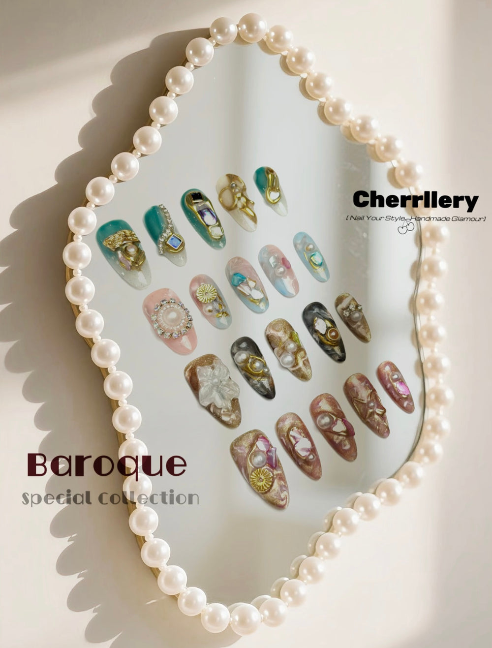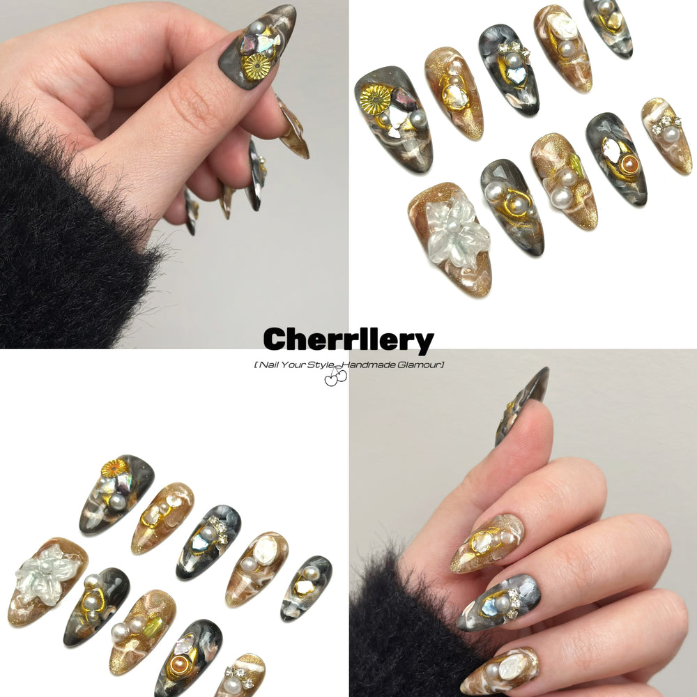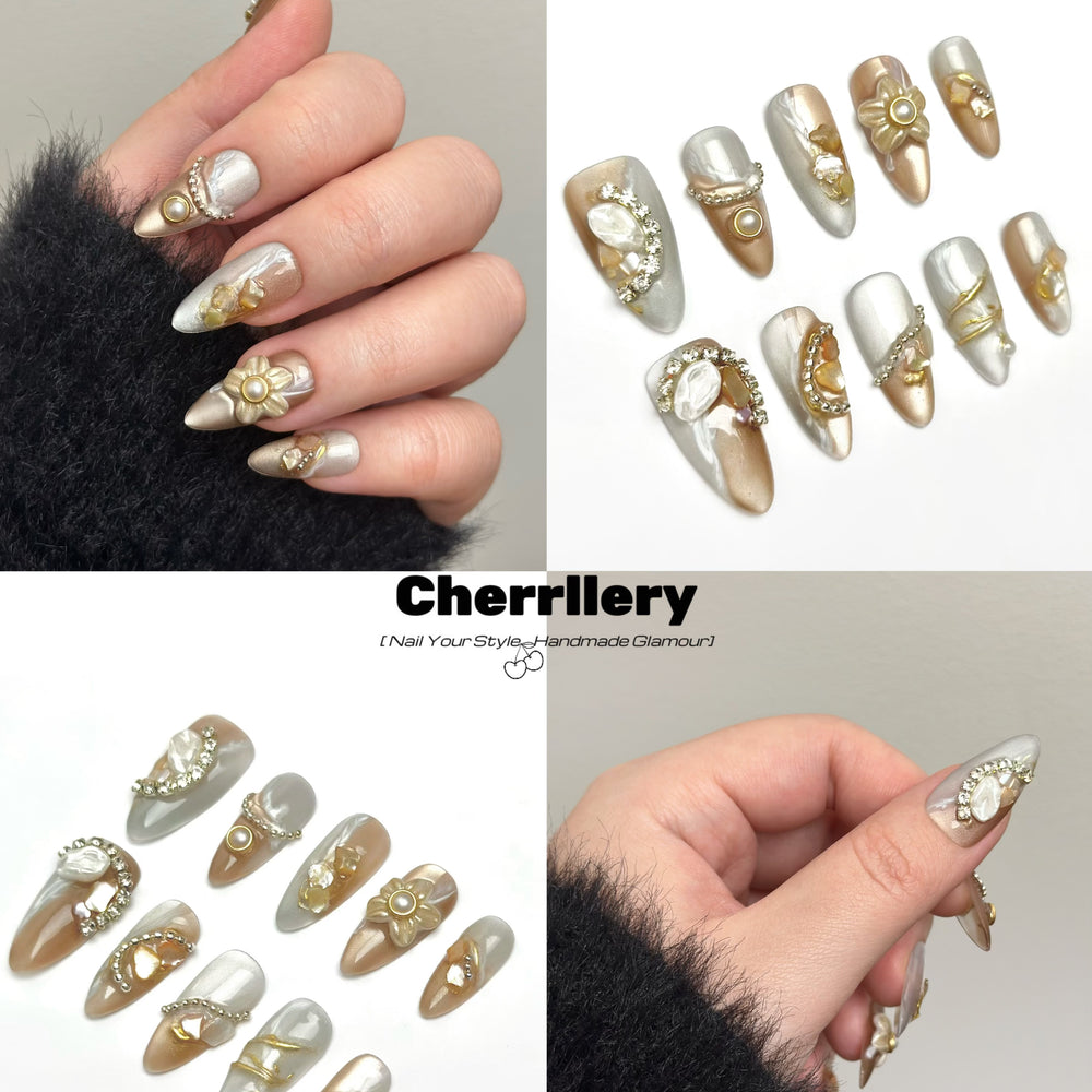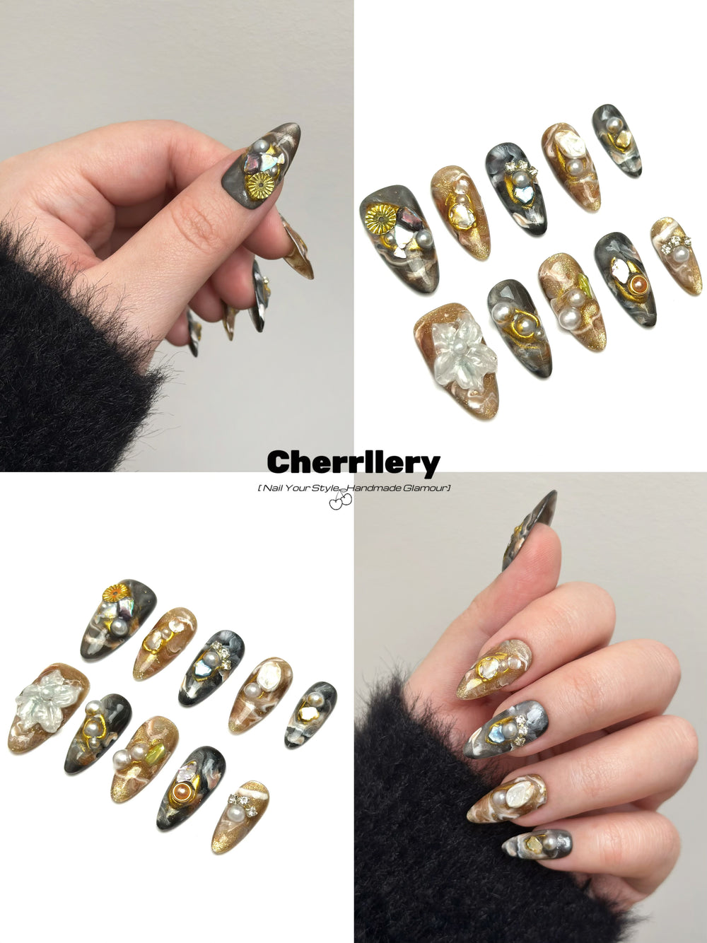 Featuring a marble cat eye base with soft shifting shine, layered with baroque pearl-like chrome and topped with gold 3D textures or sculpted floral details. The look is luxurious but not overdone — perfect for those who love artful beauty with a refined edge.