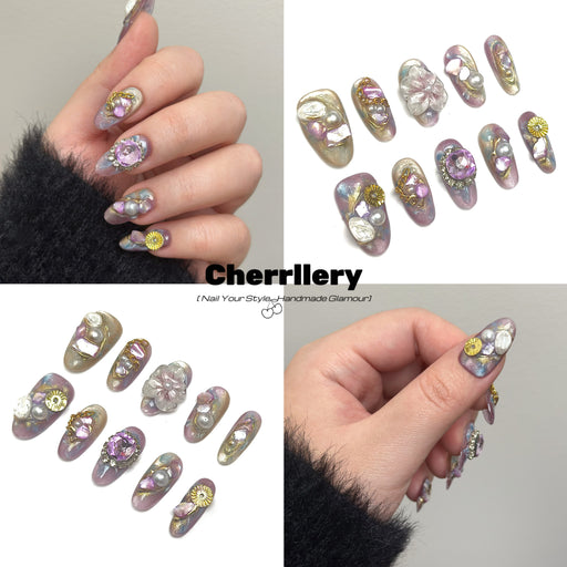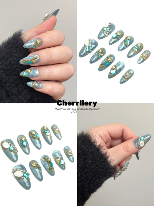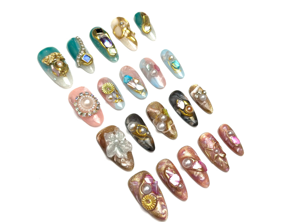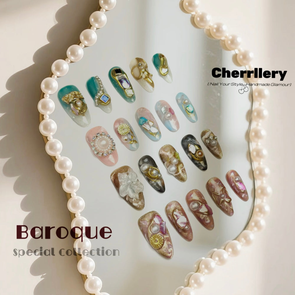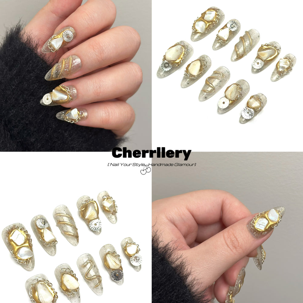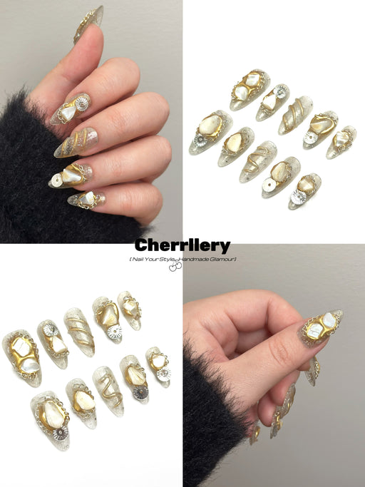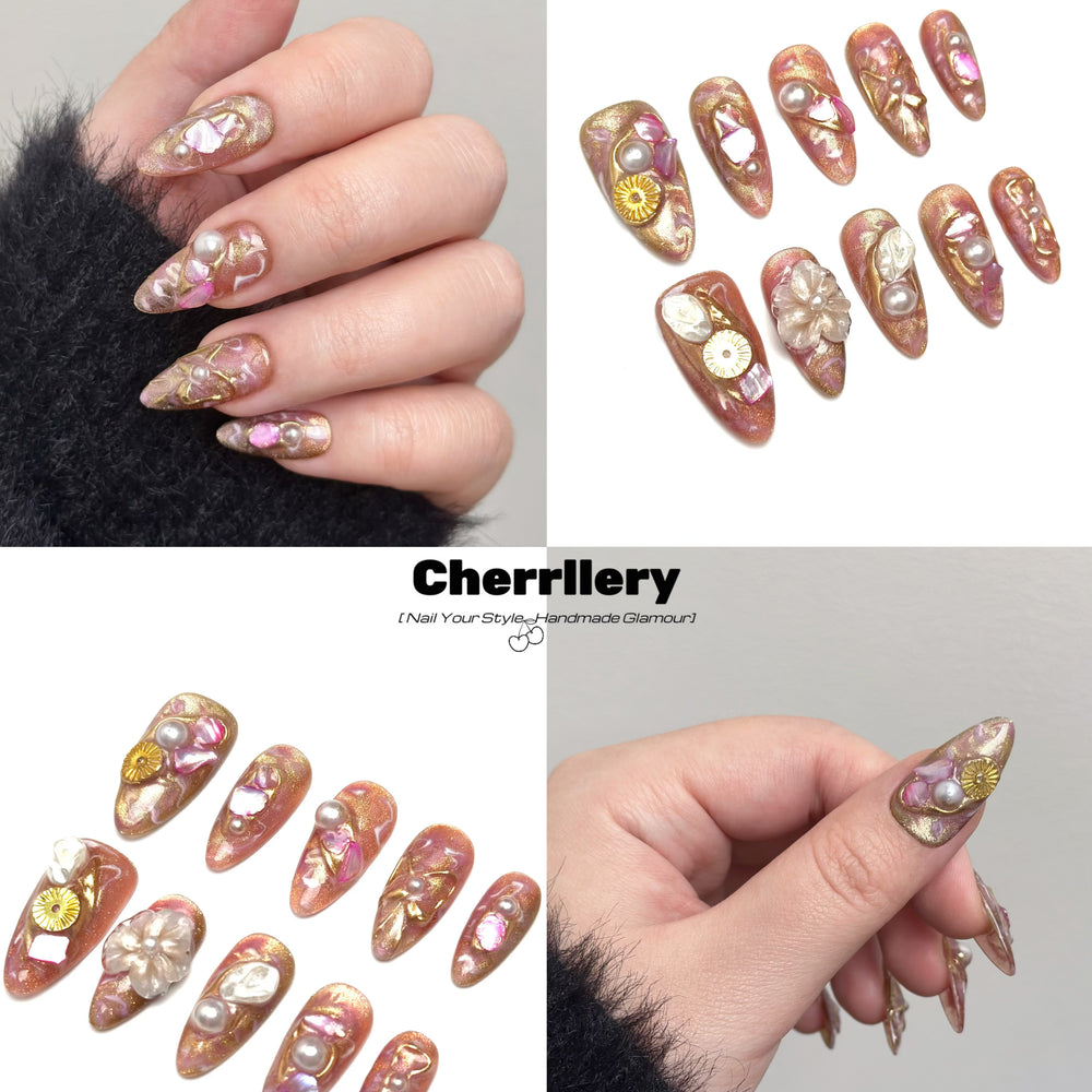 Featuring a marble cat eye base with soft shifting shine, layered with baroque pearl-like chrome and topped with gold 3D textures or sculpted floral details. The look is luxurious but not overdone — perfect for those who love artful beauty with a refined edge.