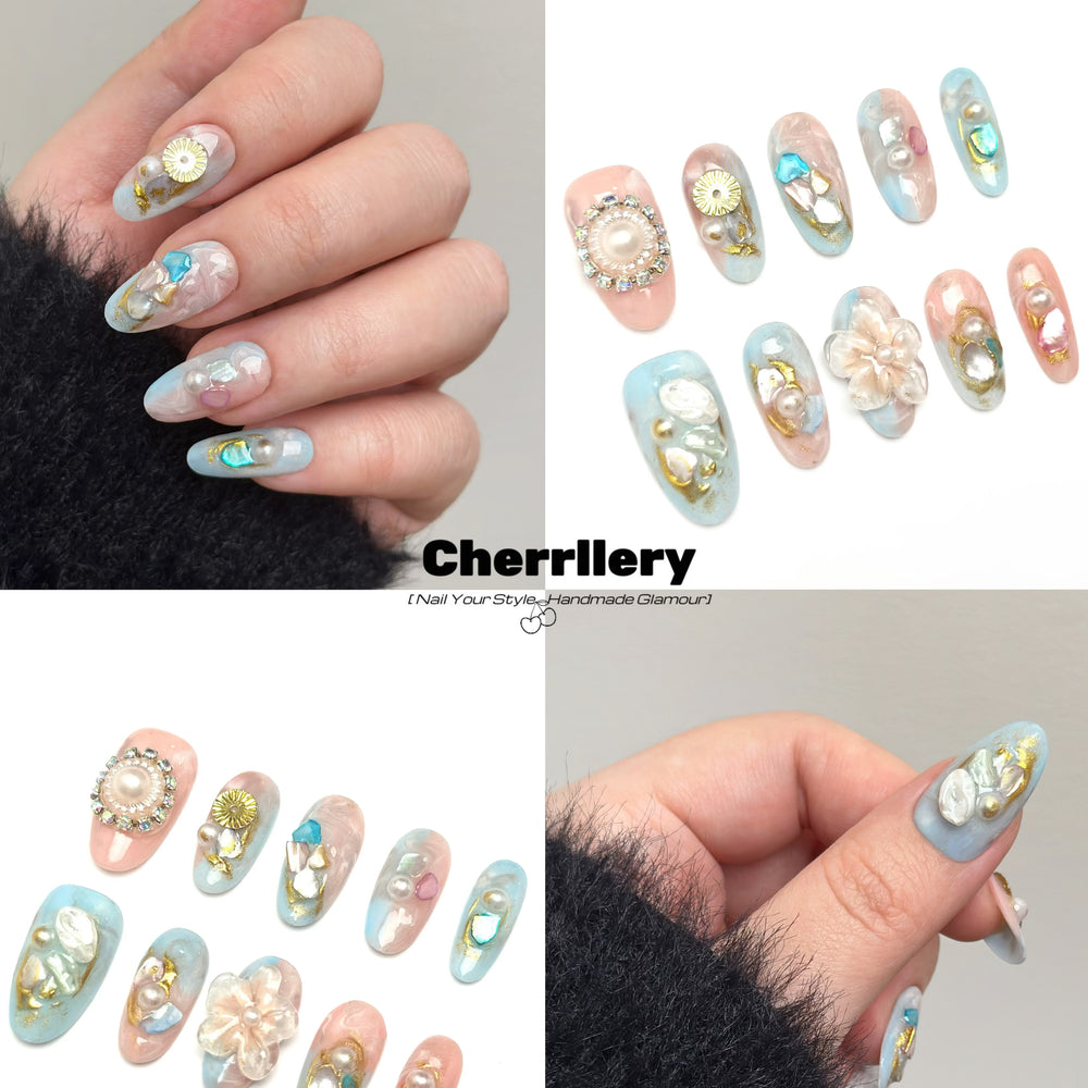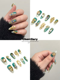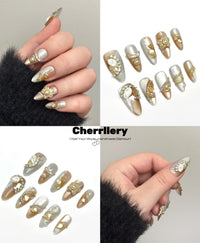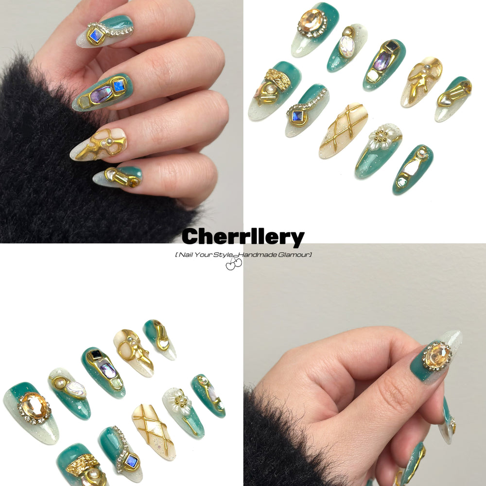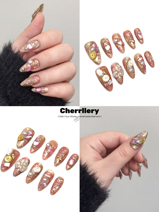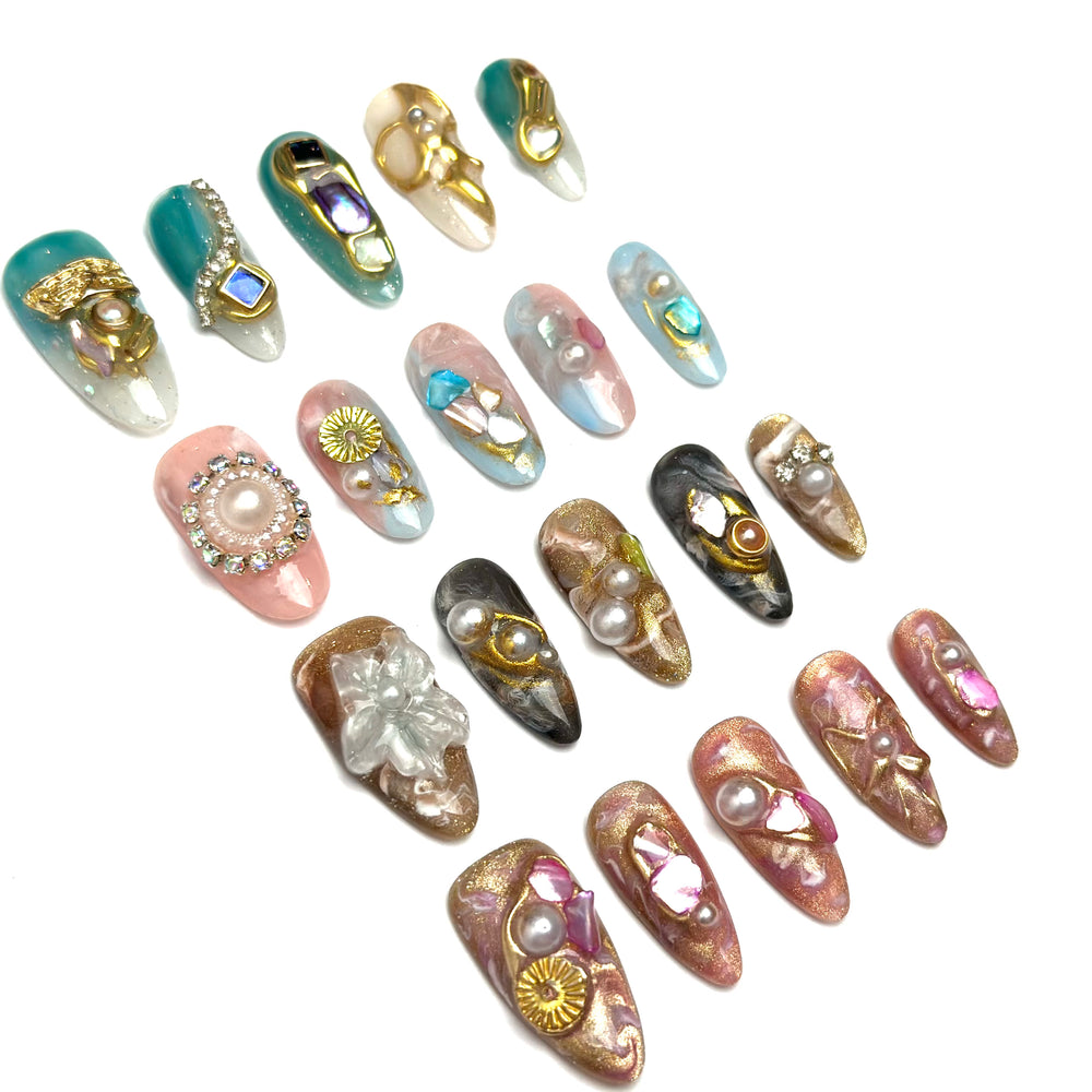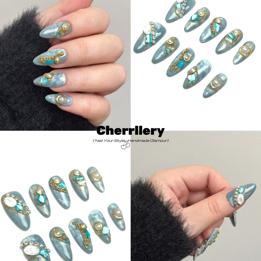 Featuring a marble cat eye base with soft shifting shine, layered with baroque pearl-like chrome and topped with gold 3D textures or sculpted floral details. The look is luxurious but not overdone — perfect for those who love artful beauty with a refined edge.
