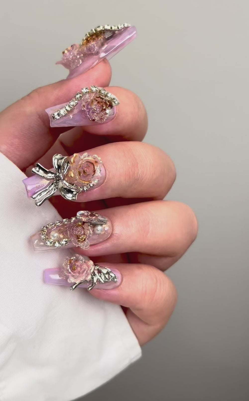 Discover the artistry of our Luxury Collection, where every set is truly one of a kind. This exclusive design features a pink and purple base adorned with delicate florals, sparkling embellishments, and a touch of gold for an opulent finish.
