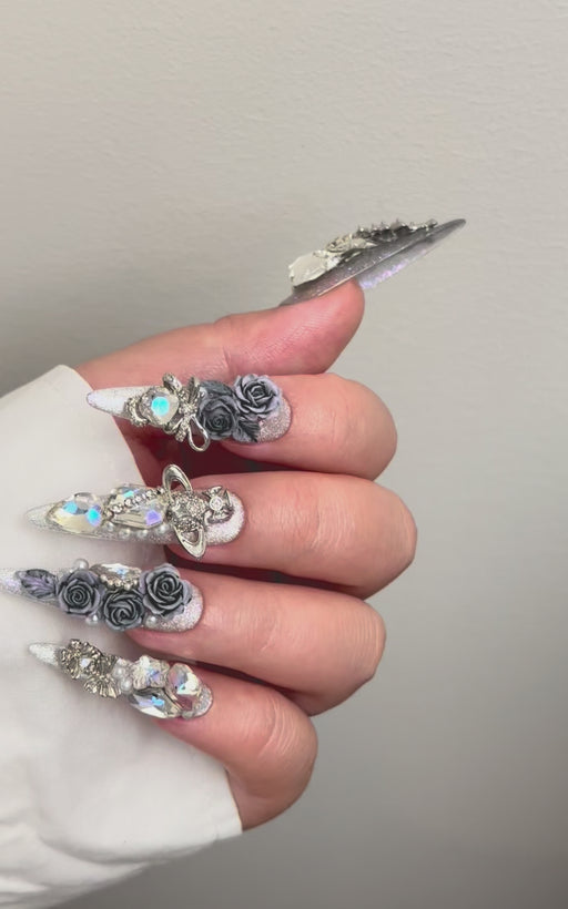 Make a statement with this sleek, elongated set featuring a silver shining base and dramatic 4.0 pointed tips that create the illusion of slimmer, longer fingers. Finished with sparkling embellishments and delicate ash grey-blue floral accents, this design blends modern elegance with eye-catching detail.