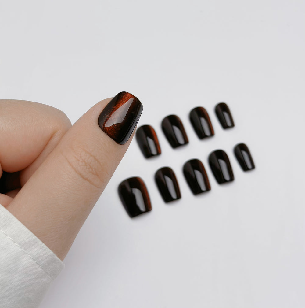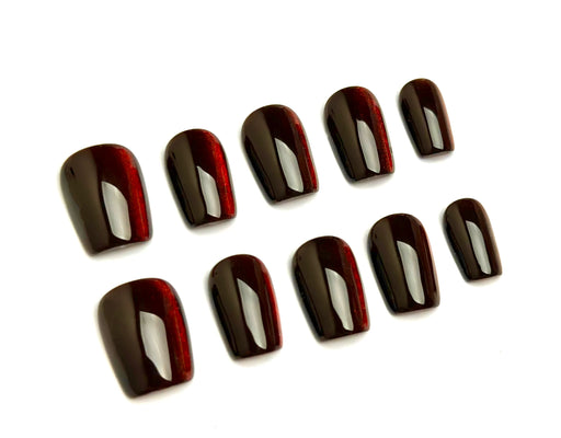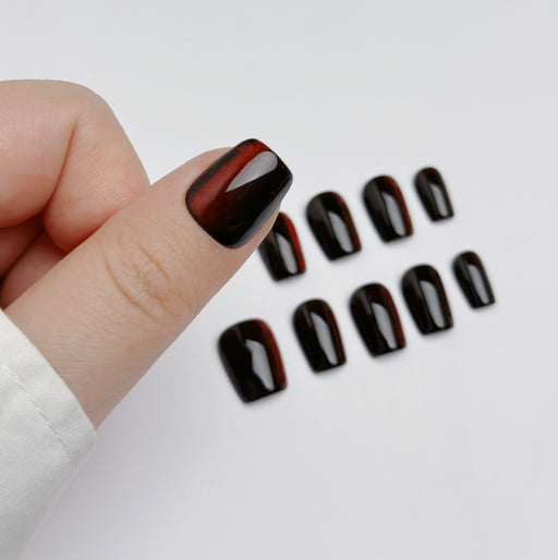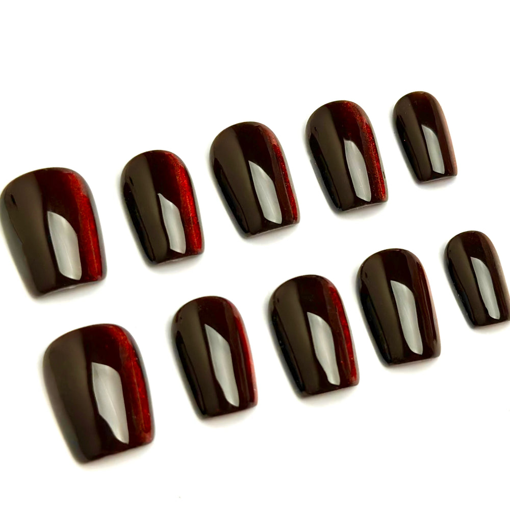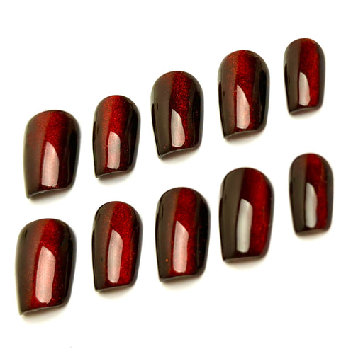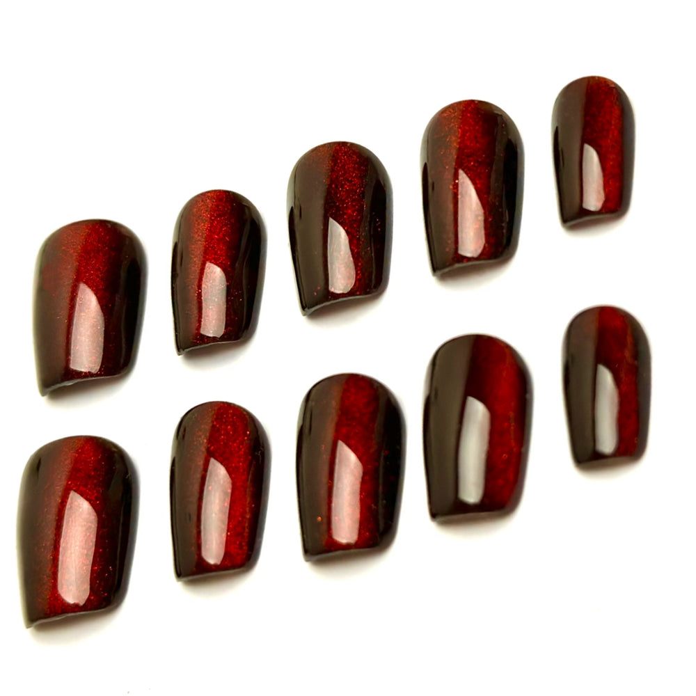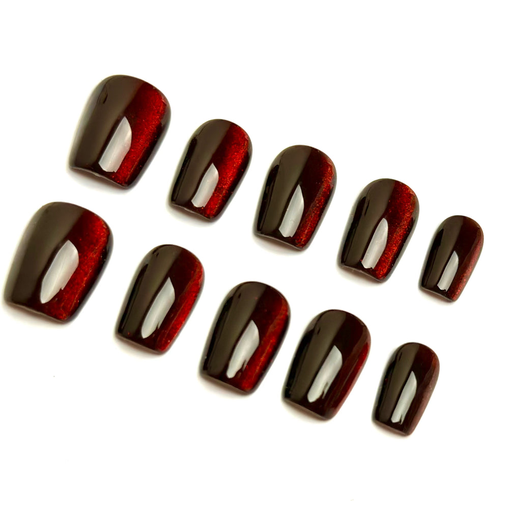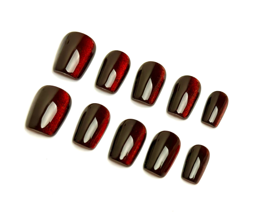 This captivating cat eye set pairs a deep obsidian black base with a dramatic dark red side-glow effect that shifts in the light—revealing a subtle ember-like shimmer from every angle.